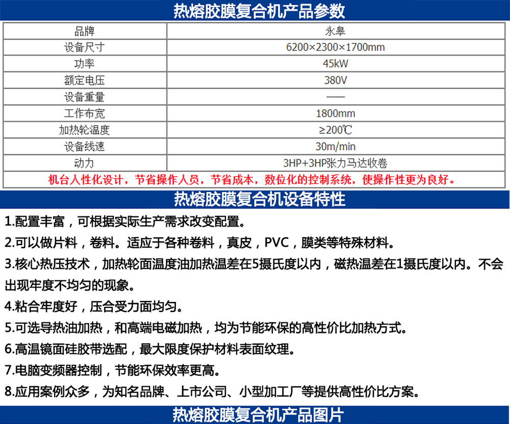 适用面料 | 用于聚酯布、无纺布等布类贴合镀铝膜、热熔胶膜、PET膜等,皮革贴保护膜 | ||