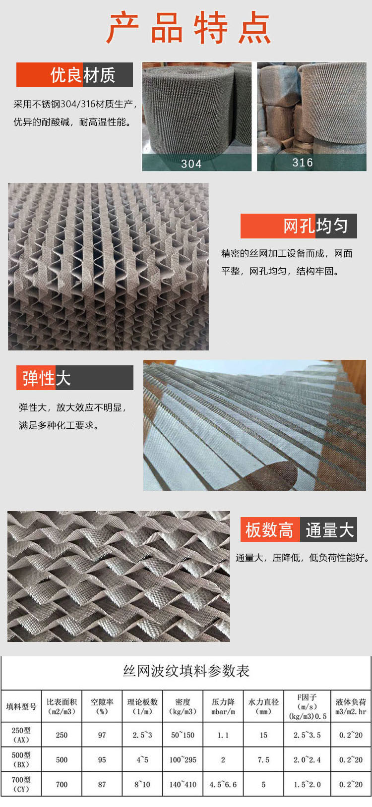 bx500/cy700/ax250不锈钢丝网规整填料 波纹状 金属316/304材质 密度 | 8.9 | ||
