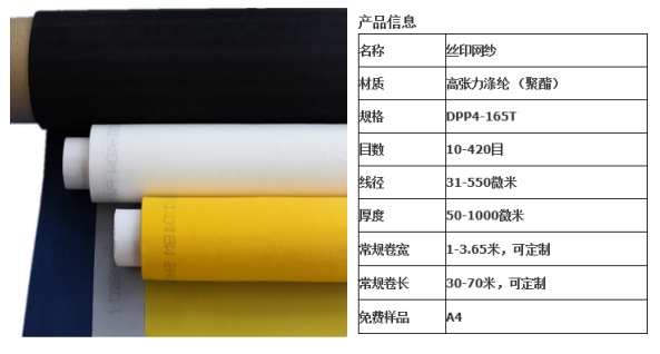 产品采用优质聚酯长丝为原料,使用瑞士苏尔寿片梭织机生产的单丝丝印网纱,产品精度高、稳定性好、规格齐全、价格实惠。