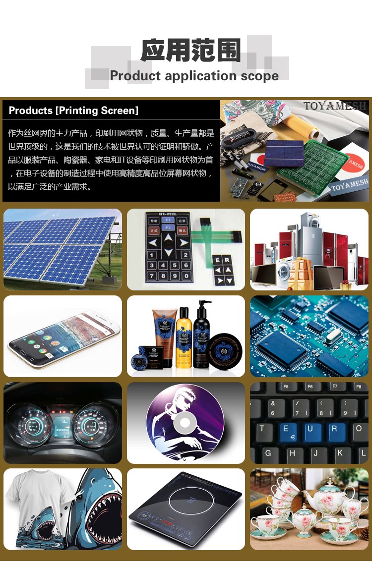 (用途)十分普遍:例如在PCB、电子、陶瓷、玻璃、塑胶、金属、纸张、纺织品、UV等多种行业。图形丝网印刷,网版印刷,玻璃容器印刷,标签印刷, DVD印刷,光盘印刷,电子业,线路板印刷,电路板丝印,PCB印刷,薄膜开关,印制电路板,太阳能电池板,厚膜,制陶业,瓷砖,间接陶瓷装饰,花纸印刷,玻璃业,汽车玻璃,建筑玻璃,家庭电器玻璃, 纺织品行业, 平板印刷,T恤,服装印花,运动用品印刷等。