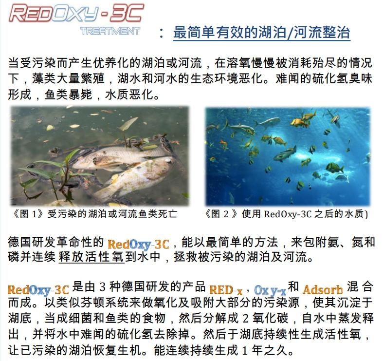 REDOXY-3C是由德国研发的产品。用于废水末端来做高级氧化,来分解溶于废水中的无机金属、溶剂类、有机物、COD、农业除草药剂、杀虫剂 、残留医用药剂和影响人体内分泌的残留药剂。几乎能去除大部分的危险污染物。非常适用于一般废水和危险废水,能达到每个国家日益严格 的废水排放水质规定标准。