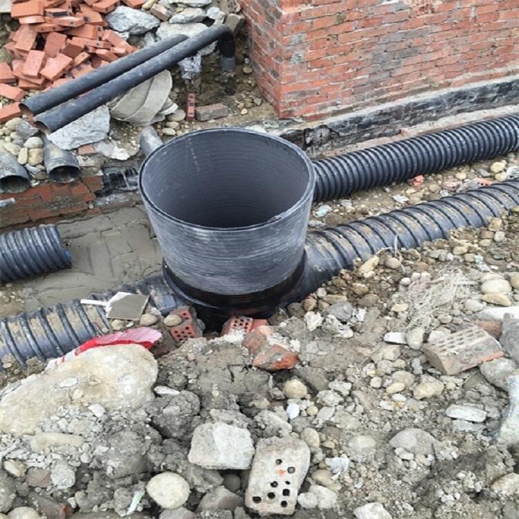 11、管道系统稳定性好:管材圆型外拉筋结构不但增加了管材的环刚度,同时具有根阻作用,解决了管道纵向移位产生的拉紧及顶井问题。
