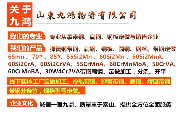 搜好货供应商山东九鸿物资有限公司供应现货65mn带钢冷轧 ?65锰弹簧钢带 ?规格0.1-3.0齐全可加工任意分条,为您提供详细的产品报价、参数、图片等商品信息,如需进一步了解现货65mn带钢冷轧 ?65锰弹簧钢带 ?规格0.1-3.0齐全可加工任意分条,请与厂家直接联系,请在联系时说明是在搜好货网看到这条商机的。