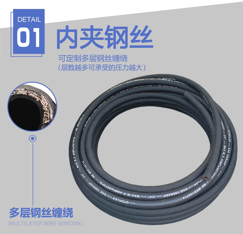 油管由钢丝缠绕骨架层和内外耐油、耐腐蚀合成橡胶组成,用于工程机械液压油管、海底天燃气、石油、灌溉、钢厂、化工厂等介质的输送。