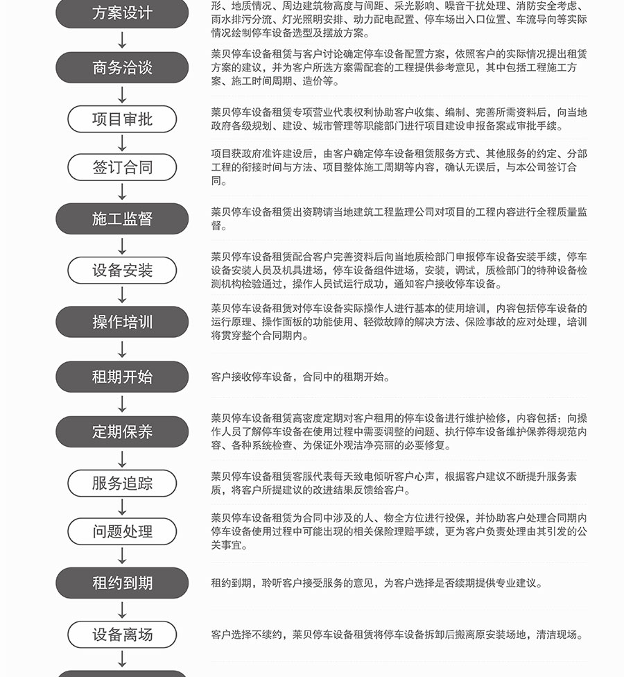 莱贝经营四川立体车库租、上下升降停车库、机械停车库双层拆除。二层升降横移停车设备?产品特点:设备为两层多列布置,每个设备分区的一层设一个横移空位。设备通过二层载车板的升降和一层载车板的横移动作实现存取车。三~七层升降横移?产品特点:设备分为多层多列布置,除顶层外每层设一空位。除底层外的所有车位均能自行升降,除顶层外的所有车位均能自行横移。当某一车位需要存取车辆时,该车位下方到空车位之间的所有车位向空位方向横移一个车位的距离,在该车位下方形成一升降通道,此时,该车位便可自由升降,当其降至地面时,车辆便可开进或开出。产品特点1、结构灵活,可根据用户要求及现场条件进行布局;2、可根据用户要求设计全包装式、半包装式、简易包装式及无包装式等包装形式。3、设备占地面积小,空间利用率高,停放车辆数量为平面停车场停放数量的5倍左右;4、设备、保费用低。5、运行平稳,噪音低,存取车方便;6、人车误入报警、限位保护、松绳保护、防坠落保护、车辆报警、保护、过(欠)压保护过流、断电自锁、紧急停车等防护;7、全自动PLC控制,采用按钮、IC卡、等多种控制方式,操作简单。