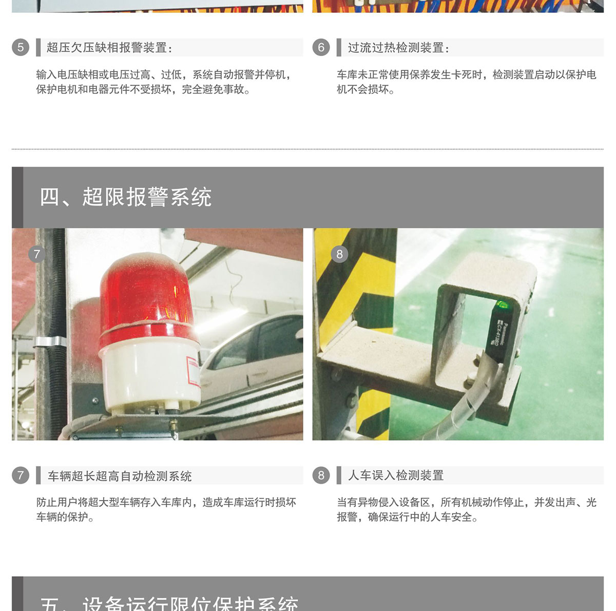 立体停车库有哪些保障安全的防护设置1)轿车开上转盘后,为了轿车停止的位置正确,有机械机构进行纠偏动作,把车辆摆正。2)轿车在转盘停止后,有轿车的三维、超宽检测,车辆的外轮廓线车位空间。3)升降机与转盘对接后,有对准检测,是在对准的情况下才能进行车辆交接。4)升降机有安全防坠装置和安全钩,车辆在升降方向在任何情况下不能下坠。5)升降机的立柱上下两端安装减速、限位检测开关,升降过程不运行范围。6)输送小车的运行方向两侧,安装车门打开检测,输送小车运行过程中,出现车门打开的现象出现。7)输送小车与货位对准有对准检测,在对准的情况下,车辆才能进行存储。8)输送小车运行方向的两端,安装减速、限位开关,运行过程中不运行范围。9)输送小车的正对货位的两端,安装有货位车辆检测开关,在货位内有车辆,不进行入库。10)输送小车的中间位置安装检测是否载有车辆的检测开关,输送小车在载有车辆、进行出入库动作的时候才能接收出入库命令。11)在每一层货位,都安装有货位检测开关,输送小车在运行的过程中,对载有的车辆和货位内的车辆出现干涉进行检测。12)货位的载车板安装有导污槽,车辆漏油、车轮泥水等留下,污染下层车辆。13)货位安装有安防检测系统,车辆出现自燃时,及警或者喷水。14)层移小车上安装有无线头,在出入库过程中,有影像进行和查看。15)系统设计了备用输送小车、备用升降机、备用发电机,车辆能够全天候进行存储。16)一旦设备出现故障,可以手动操作设备把车辆从库内取出。17)立体库区顶上和四周安装防尘罩、周边安装防护栏,在适当位置设置声光指引。18)监控系统中设计了故障报警指示和解决办法,让操作人员能够及时处理故障。