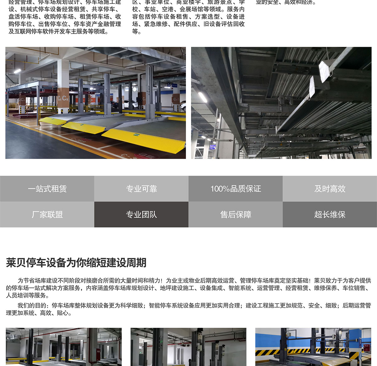 LAIBEI莱贝主要有:达州宣汉立体车库租赁、枢纽立体车库、二手智能停车设备租用等。仓储式平面移动类立体车库采用前进入库而不是倒车入库。当车进入车库前,应注意观察车库出入口处的。上,一般会标明适停车辆的尺寸及重量。如果您的车辆符合标准,才可以停放到车库里面。当您的车辆符合标准时,可以继续向前驾驶。此时用户会看到旋转平台的前方有个停车指示的电子屏幕。如果您车辆停放,指示会提示"向前",提示您继续向前驾驶。此时,速度要慢。当看到指示电子屏显示"停止"时,说明你已经把车辆停放到的位置了。此类仓储式平面移动类立体车库会有自动对中装置,如果您的车辆停偏了,车库中的搬运机器人会将您的车辆居中置。此类立体车库的出入口一般会设置一个停车用的旋转平台,用户停放车辆到选择平台的位置后,就可以到出入口离开了。