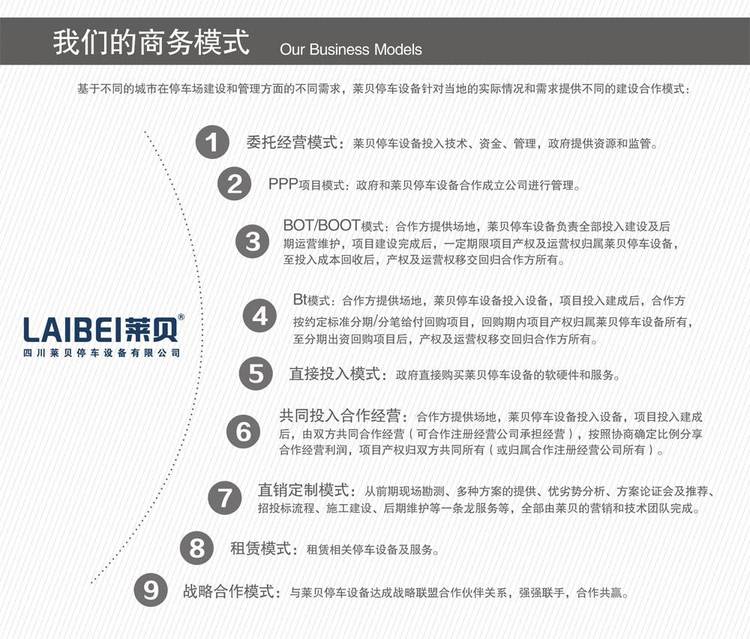 四川莱贝停车设备有限公司致力于渭源立体车库租赁、机械立体车库二柱、公共立体停车库安装、机械停车设备销售、机械式立体车库设备经营租赁、立体停车场建设、停车场经营管理、停车场规划设计、停车场施工建设、共享停车、盘活停车场、收购停车场、租赁停车场、收购停车位、出售停车位、停车资产管理及互联网停车软件开发车主服务等领域。我们为机场、车站、商场、大学、住宅、酒店、p r停车等各种停车类型,从一个停车场一个区域到一个城市提供停车位经营解决方案。公司严格按照iso9001:2015质量管理体系、iso14001:2015环境管理体系、iso45001:2018职业健康管理体系要求,优化组织架构,规范内控体系,明确部门分工,积极 市场。业务特色鲜明,在市场营销、风险控制、人力资源管理等方面均衡发展,形成覆盖全国的业务网络,建立了科学的管理模式。公司与多家机构、设备制造商、服务团队、停车管理等多家企业形成战略合作关系,抓住历史机遇,在尽可能短的时间内,做大做强做牌。不断设计并优化停车场方案,为客户提供多元化的立体停车场经营以及技术支持服务,致力于成为国内立体停车场经营提供商。为了响应快速发展的停车需求和引入社会资源优化停车产业结构的号召,莱贝停车设备配合政策,解决城市停车难题,将未来停车产业推向新的领域。公司利用人才、技术和设备 ,租赁一系列适合国情的产品。主要有:渭源立体车库租赁、机械立体车库二柱、公共立体停车库安装、简易升降式、升降横移升降式等。该产品具有占地面积少、空间利用 安装方便、能耗低、噪音小等特点,适用于各种场地和建设要求。公司为客户提供立体车库规划计划、施工设计、安装调试、运营培训、技术支持、机械停车设备销售、租赁、回收等多项服务。