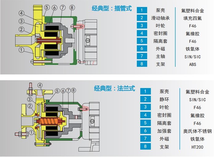 CQB型氟塑料磁力泵,是我公司根据老款磁力泵改款设计而来的新型氟塑料磁力泵,引进国外先进的设计工艺,全系采用氟塑料合金制造。除熔融碱金属及氟单质外,可输送任意浓度的酸、碱、强氧化剂等。CQB型氟塑料磁力泵取消了轴封,利用磁力耦合驱动,完全消除了滴漏烦恼,绝不污染使用场地,是保护环境,安全生产的最优选择。