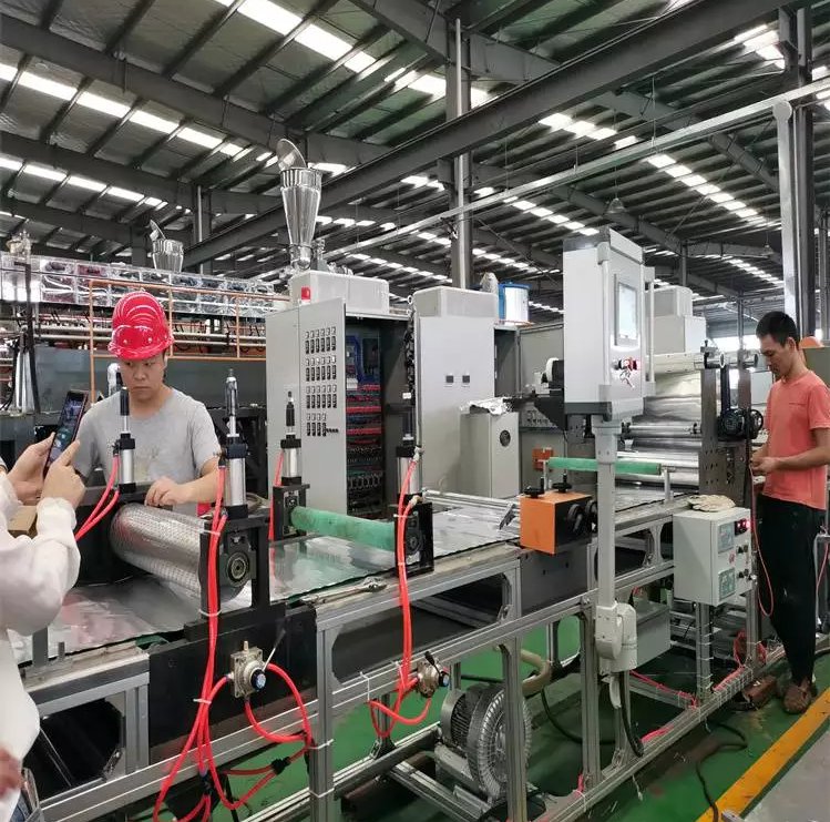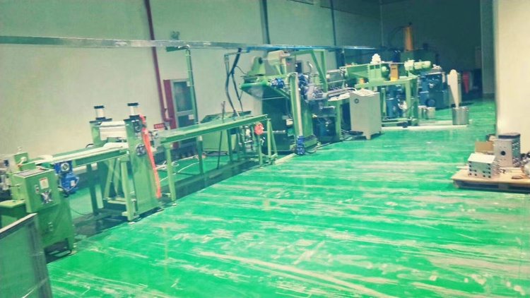 挤出工艺:强制喂料机——KMD120单螺杆挤出机-----模具接口------丁基胶胶用模具------5米橡胶输送带------二棍覆膜辊-----上下覆膜装置------二辊压花-----移动切刀系统(公司发明产品)-----1.5米输送带-----主机采用:PLC控制;