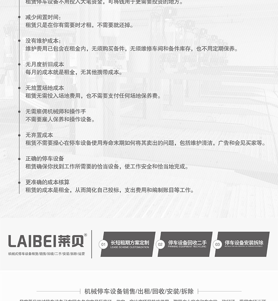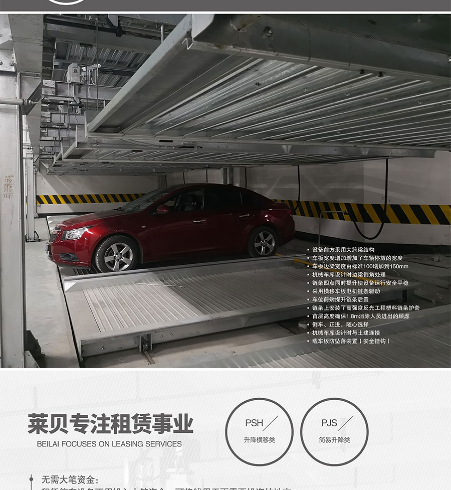 莱贝经营四川立体车库租、上下升降停车库、机械停车库双层拆除。二层升降横移停车设备?产品特点:设备为两层多列布置,每个设备分区的一层设一个横移空位。设备通过二层载车板的升降和一层载车板的横移动作实现存取车。三~七层升降横移?产品特点:设备分为多层多列布置,除顶层外每层设一空位。除底层外的所有车位均能自行升降,除顶层外的所有车位均能自行横移。当某一车位需要存取车辆时,该车位下方到空车位之间的所有车位向空位方向横移一个车位的距离,在该车位下方形成一升降通道,此时,该车位便可自由升降,当其降至地面时,车辆便可开进或开出。产品特点1、结构灵活,可根据用户要求及现场条件进行布局;2、可根据用户要求设计全包装式、半包装式、简易包装式及无包装式等包装形式。3、设备占地面积小,空间利用率高,停放车辆数量为平面停车场停放数量的5倍左右;4、设备、保费用低。5、运行平稳,噪音低,存取车方便;6、人车误入报警、限位保护、松绳保护、防坠落保护、车辆报警、保护、过(欠)压保护过流、断电自锁、紧急停车等防护;7、全自动PLC控制,采用按钮、IC卡、等多种控制方式,操作简单。