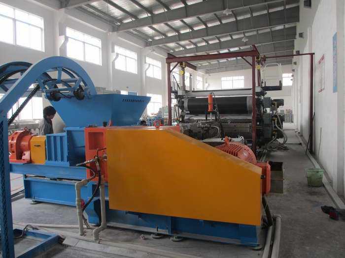 加压式密炼机→自动不锈钢提升机→强制喂料机→GLD单螺杆→2500mm成型模具→三辊挤压表面处理→牵引机→板材电晕处理?→?切割机?→?堆放?