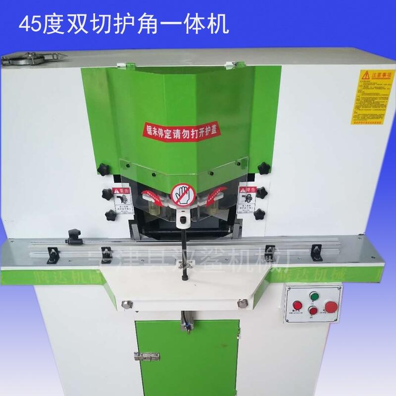 汉鲨双45度双锯切角机切角护角一体机适合(推开门窗框、铝相框、镜框、展示柜、空调出风口、灯箱、屏风、饰条、铝封边、橱柜、灯具、画框。操作方便简单,工作效率高,切割精确高,省人工,操作方便.是铝材、木材45度斜角加工的机械设备.
