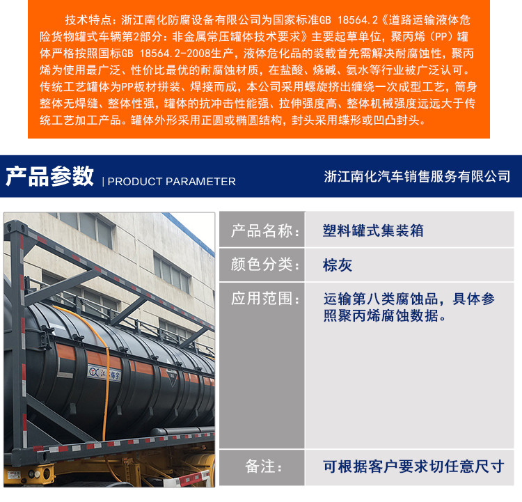 机电之家网厂家浙江南化防腐设备有限公司为您提供浙江南化 30英尺塑料罐式集装箱的详细产品价格、产品图片等产品介绍信息,您可以直接联系厂家获取浙江南化 30英尺塑料罐式集装箱的具体资料,联系时请说明是在机电之家网看到的。
