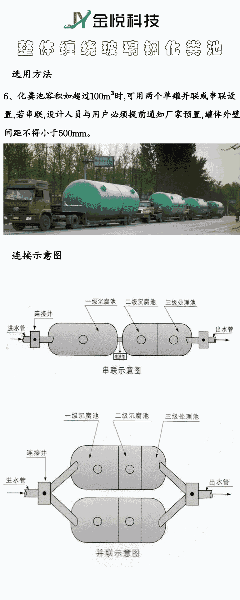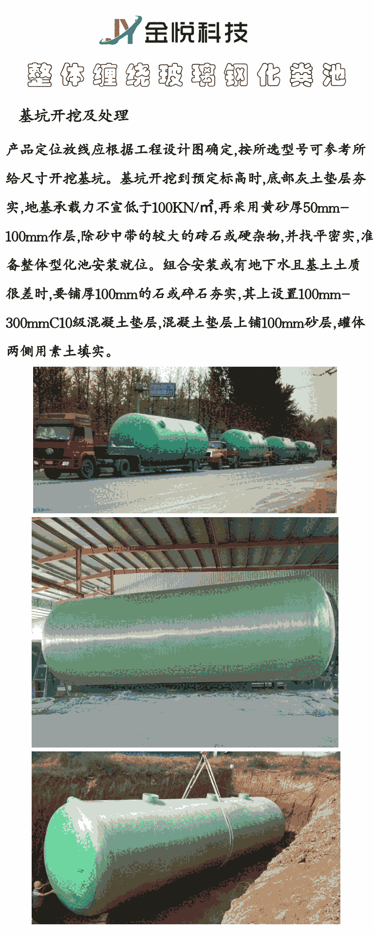 整体化粪池是以玻璃纤维增强不饱和聚酯树脂的高强度玻璃纤维复合材料为主体材料,采用先进的玻璃钢缠绕工艺制作筒体加凹凸面车轮形封头结构。简体的壁厚、加盘的间距等采用 ansys结构计算软件进行强度、钢度优化设计、结构设计独特、技术领先,具有质量轻、强度高、耐腐蚀性好、无渗漏、无污染、成型性好、使用寿命长等特点。池体两端设有进、出水管和罐顶设有检查井口,池内用隔仓板分格,并设有环流泛水装置以增加污水滞留时间,提高腐化效果。