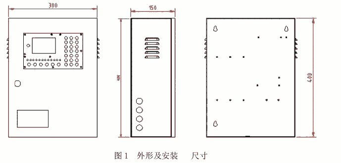 监控器的外形尺寸为:长×宽×高=300×150×400,单位:mm。外形及安装尺寸图如图