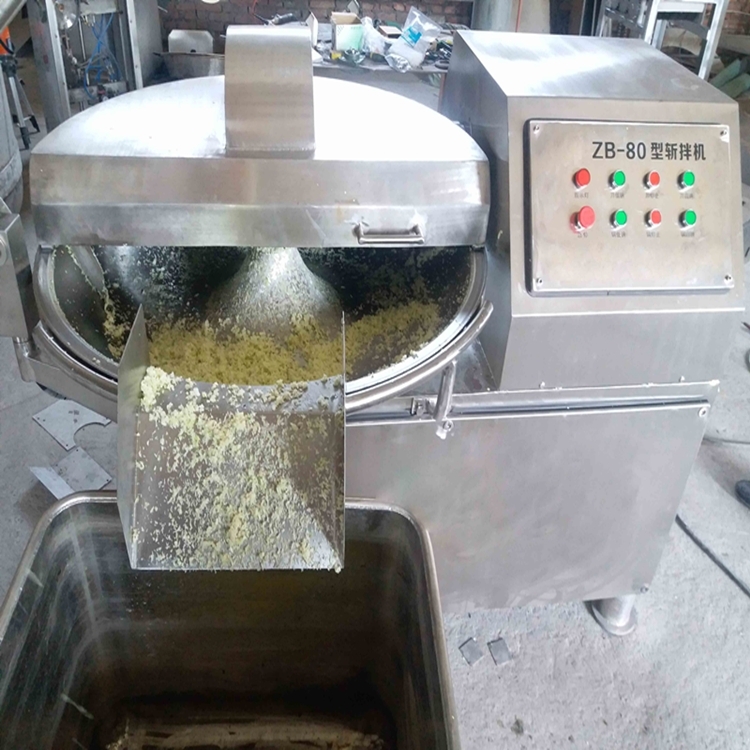 斩拌机是用来斩切肉馅的设备,斩拌机绞肉是通过斩刀的高速旋转是肉在斩锅内被均匀的斩碎成肉泥,并能使一并加入其中的辅料一同被搅碎成泥装,在均匀的混合在一起,对于蔬菜(韭菜、粉条、萝卜、青椒、土豆等)同样具有良好的斩拌效果。可广泛应用于肉类、鱼类、水果、蔬菜、坚果类的粉碎加工。提高了肉制品乳化效果、弹性及细腻度,保证了绿色肉食品加工的原态。