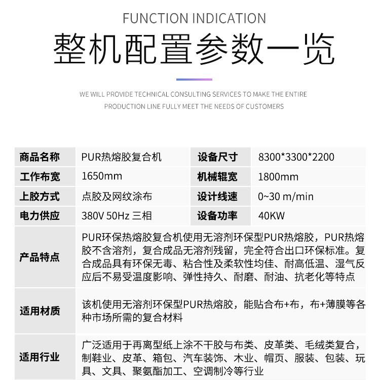该机使用无溶剂环保型PUR热熔胶,能贴合布+布,布+薄膜,海绵+皮革、无纺布等各种市场所需的复合材料。