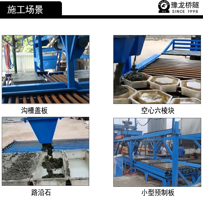 豫龙混凝土预制构件生产线,是国内高性能混凝土预制构件设备,该设备有着独特的优势,安装简单,拆卸方便,适应各种路桥工程建设和野外临时场地,产出效率高于同等规模设备,不仅能生产六角护坡,边沟盖板,还有U型排水沟,骨架挡水快,路测石,手孔井盖板。 小型预制构件生产线 小构件预制设备 自动化预制块生产设备。