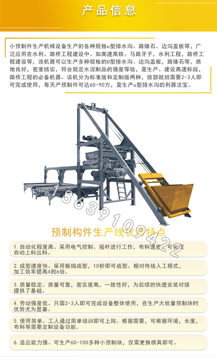 考虑到预制件设备某些部件,经常处于混凝土摩擦的磨损状态下,部件的磨损较为严重,因此在设计时对相关的易损部件进行了的处理,还特别配备了清洗踏步,方便使用后进行清洗,从而延长了设备的使用寿命。 小型预制构件生产线 小型预制块振捣设备 全自动小构件生产线设备。