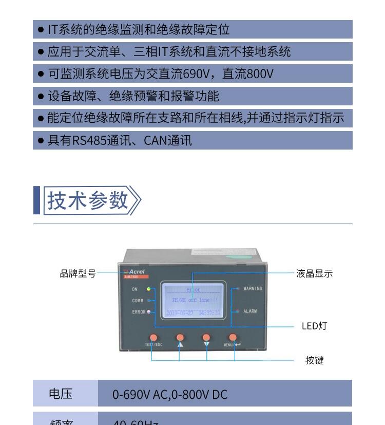 IT系统与大地是完全隔离,或者经过大电阻接地的,在次故障时,可带故障运行。但是如果次故障不能及时排除,而后出现的第二次异相接地故障将会带来严重的后果,在不接地系统中安装绝缘监测仪的目的就是当系统出现次绝缘故障的时候及时报警,提醒工作人员排查现场,处理接地故障。确保不接地系统连续、可靠的运行。