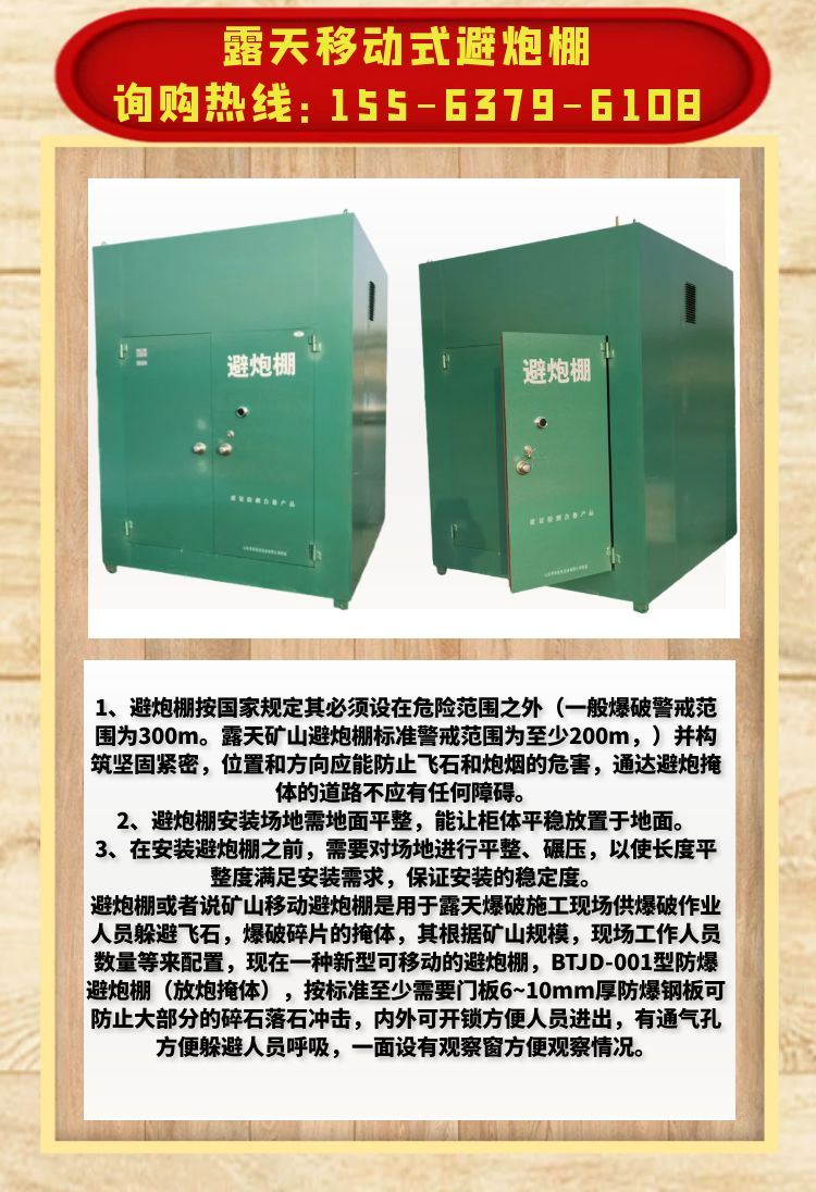 这种避炮棚或者说矿山移动避炮棚是用于露天爆破施工现场供爆破作业人员躲避飞石,爆破碎片的掩体,其根据矿山规模,现场工作人员数量等来配置。现在一种新型可移动的避炮棚,BTJD-001型防爆避炮棚(放炮掩体),按标准至少需要门板6~10mm厚防爆钢板可防止大部分的碎石落石冲击,内外可开锁方便人员进出,有通气孔方便躲避人员呼吸,一面设有观察窗方便观察情况。此外,BTJD-001型防爆避炮棚已通过取得了《公安检测认证》《防爆检测报告》以及《防静电检测报告》等证书。