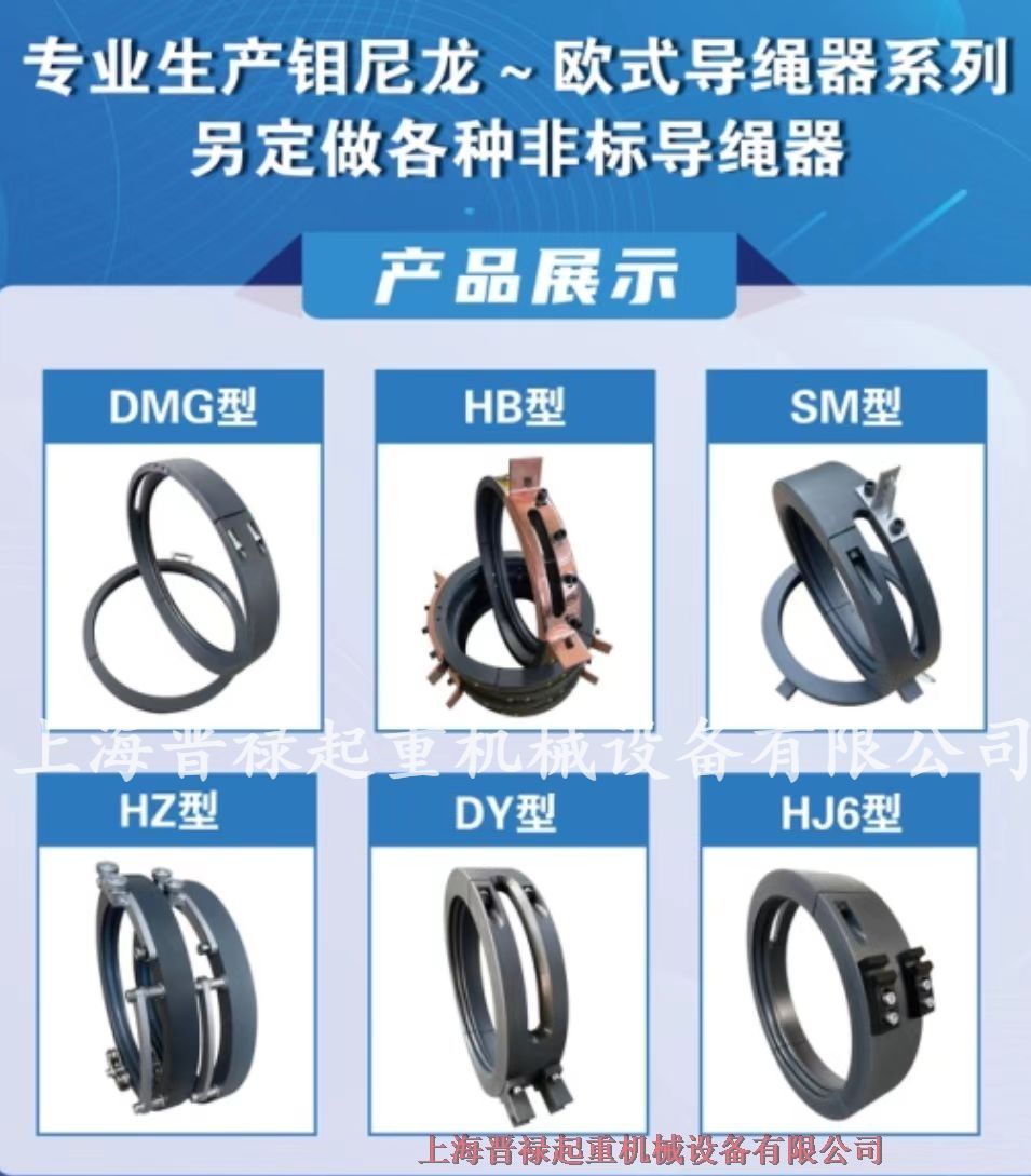 欧式电动葫芦导绳器卫华重型纽科伦 矿山 圣起上海鹏重等欧式尼龙原厂排绳器导绳器,导绳器又称排绳器是电动葫芦的部件之一,也是损耗品。作用使钢丝绳能整齐地按顺次卷绕排列在电动葫芦卷筒上。防止钢丝绳混乱,重叠而引起电动葫芦发生故障。 其包括:卡箍,其包括有纵向出绳槽和连接面;连接板,其通过螺钉固定在所述卡箍上,固定连接所述连接面的两侧,其包括有一导绳槽,所述导绳槽与所述卡箍上纵向出绳槽位置对应且大小符合,其由左右对称的左连接板和右连接板构成,所述左连接板和右连接板通过螺栓对齐连接固定。 导绳器除磨损外也有因为电动葫芦吊钩上升太快碰到导绳器而损坏的。 导绳器的型号对应电动葫芦有:0.5t、1t、2t、3t、5t、8t、10t、16t、20t等。其中10t电动葫芦上装有2个导绳器,分为左右型。 导绳器一般根据材料及材质不同分为:普通铸铁、加厚铸铁、铸钢、钢筋、钢管、玻璃纤维钢化尼龙等材质。