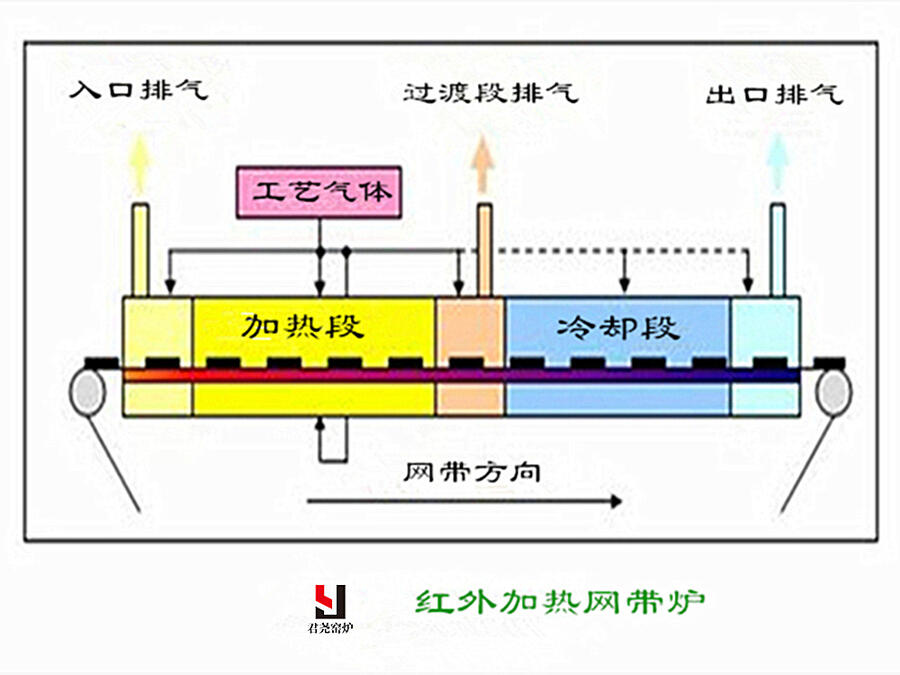 此网带炉为红外加热连续带式炉,红外加热是一种直接加热的方式,热直接被产品吸收。因为热直接传递到产品,而不是通过空气等中间介质,所以产品和产品之间无温差,炉内温差也小,并且红外加热元件占炉内的空间小,比传统电阻加热省电。