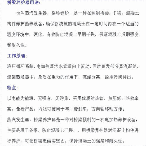 一、蒸汽养护(全自动桥梁养护器)是将混凝土构件放在蒸汽养护室,通入水蒸汽使混