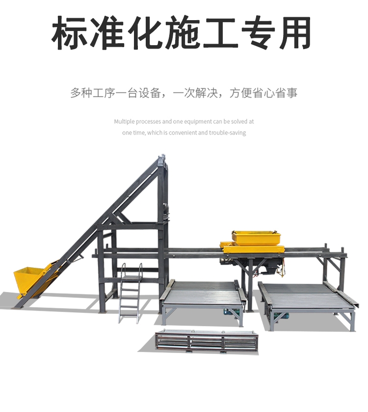 布料车一和二通过布料螺旋将混凝土浆料向适时适量向模盒布料。模盒通过振动辊台的振动实现成型,成型后经过振动辊台输送到动力输送辊待。动成型后的在动力输送辊上累积够一定数量后经叉车叉走进行养护。 小型预制构件布料机 混凝土盖板预制设备 预制块码垛机