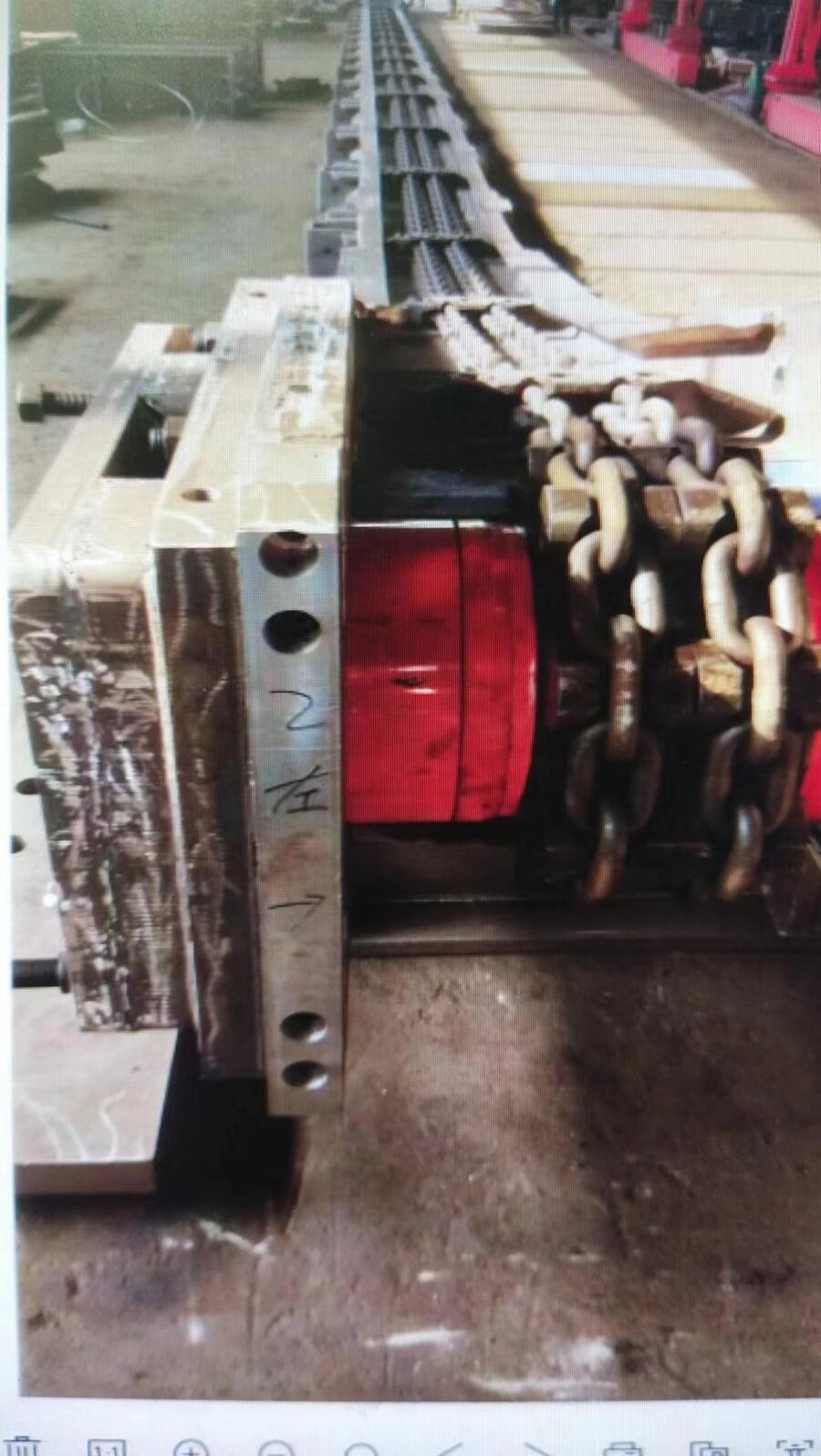 SZZ800/200顺槽刮板转载机本实施例利用拉紧件使滚筒相对机架向拉紧链条方向移动,从而实现滚筒上链条的张紧,当圆环链置于链槽上时,处于水平状态的圆环链平环架设在链槽的上表面上,而处于竖直状态的圆环链竖环下半部容纳于链槽内,链槽也对竖环起到限位作用。SZZ800/200顺槽刮板转载机优选的,轴承数量为两个,且两个轴承分别固定在轴上靠近链轮的两侧,丝杠端部开设有使手持杆穿过的通孔,通过转动手持杆,能够使丝杠带动滚筒相对机架发生移动,使滚筒上的链条张紧。