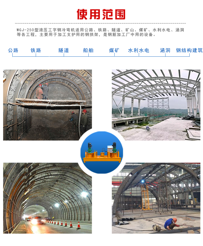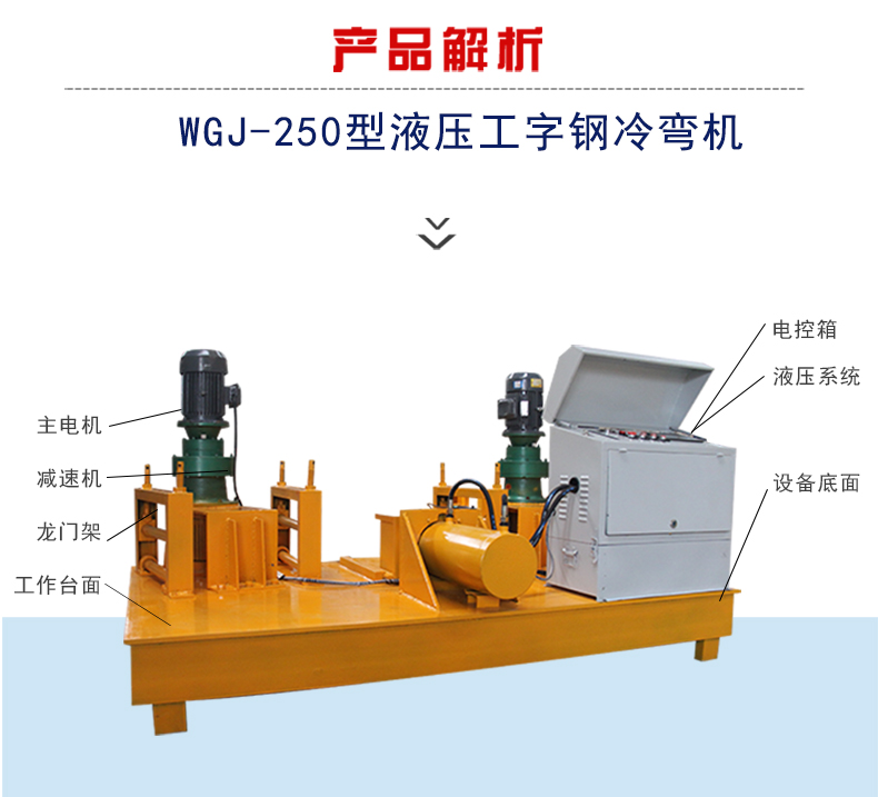 我厂主营的型号有:250型、220型、300型、320型等型号,操作简单,一机多用,适用于工字钢、H型钢、槽钢、方钢等钢材的冷弯加工,工字钢顶弯机 全自动数控工字钢冷弯机 小半径隧洞冷弯机需要接三相电,整机瓜式操作,容易上手,一人操作即可。
