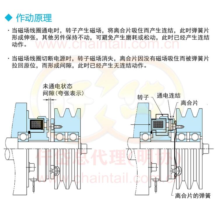 电磁离合器靠线圈的通断电来控制离合器的接合与分离。干式单片电磁离合器:线圈通电时产生磁力,在电磁力的作用下,使衔铁的弹簧片产生变形,动盘与"衔铁"吸合在一起,离合器处于接合状态;线圈断电时,磁力消失,"衔铁"在弹簧片弹力的作用下弹回,离合器处于分离状态。