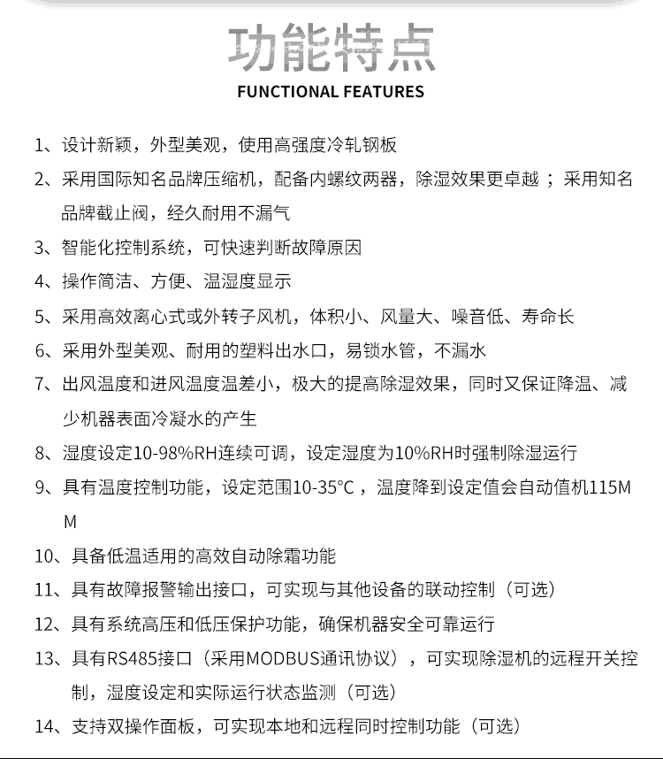 百科特奥品牌冷风调温除湿空调机是一种利用冷冻除湿原理来除去空气中所含水份,降低空气湿度调节环境温度的设备;是集中央空调及普通除湿机于一体的现代化除湿设备。采用名牌压缩机,微电脑控制,带有温湿度设定和显示现时温湿度功能,具有适用范围广,除湿效果显著,外形美观,结构紧凑,功能齐全,运行宁静,耗电量少,可靠性能高,操作简便。已被广泛应用于科研、交通、工业、医疗卫生、商品、储藏、地下工程以及资料室、档案馆、图书馆、电力、电信、卷烟、医药、印刷、茶叶、纺织、仓库等对温湿度要求较高的场所,可防止仪器仪表、电讯器材,食品、商品、药品、资料等因受高温高湿而造成不必要的损失。