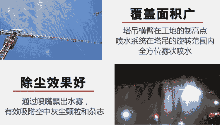 1、喷淋降尘:利用水井或消防水池中的水通过“塔吊喷淋降尘系统”形成飘飞的水雾,吸附空中的灰尘颗粒和杂质,在现场风速低于二级风情况下,可使施工现场大气中颗粒物浓度减少85%,同时在高空喷淋一段时间后,是地面将形成一片湿润状态,有效灰尘的再次扬起。