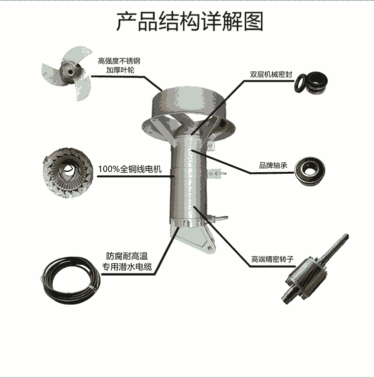 潜水搅拌器在水下连续工作,同时能保证在间隙运行和长期停止运行的情况下,一经开机仍能正常运行;