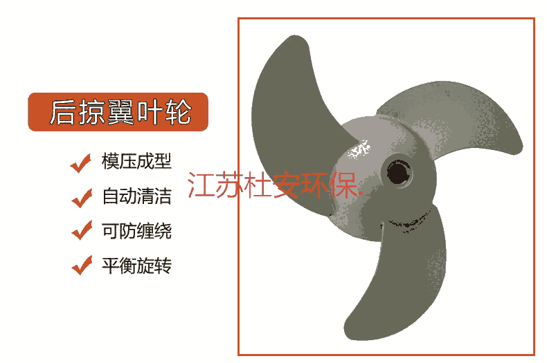 叶轮:用不锈钢材料304或不锈钢316L 制造,并经过动平衡实验和精心加工,水力平衡的无堵塞的拽后设计,能高效率地传递电机输出功率进行混合和推进池底污水流动。为使叶轮避免阻塞结渣,为防止在运转时叶轮与轴产生松动,可采用内部锁定装置。