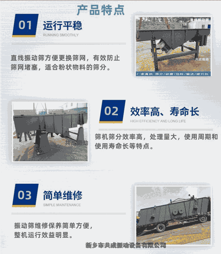 草坪石英砂筛选机直线振动筛ZDS-1040筛体产生水平、垂直、倾斜的三次元运动,使物料在筛网上被抛起并由中间向外旋转扩散到出料口排出,物料在筛网上面的运动中,细小颗粒或液体透过筛网,通过选择安装相应的筛网和筛网层数使物料完成筛选分级或过滤,分选出的物料由各自的出料口分别自动排出。