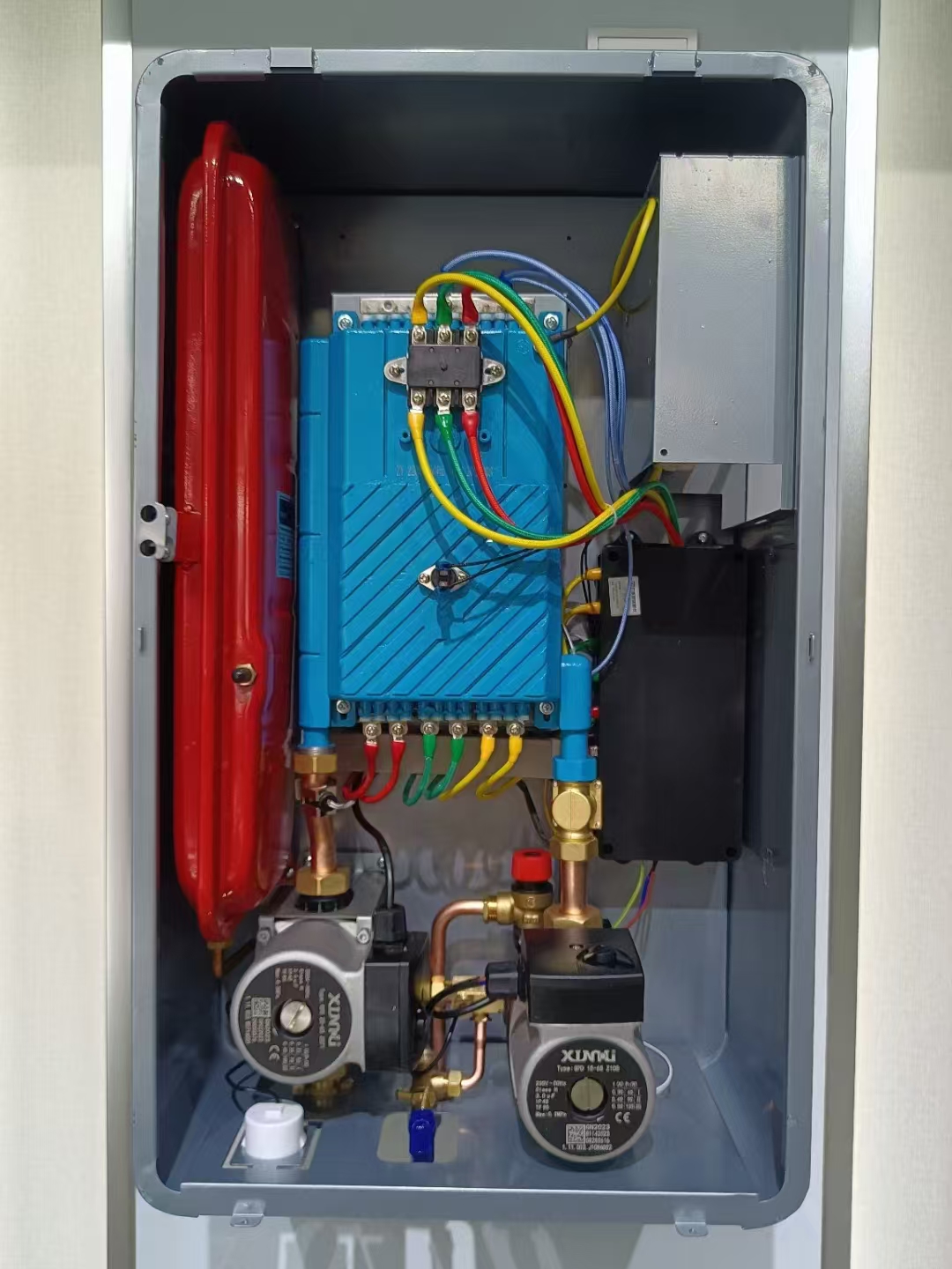 2、结构上内置水泵、内置膨胀水箱、并且设置了加水阀、水压表、超压泄压阀,采用铜管连接,加热器内部水路为不锈钢,不易锈蚀,皮实好用;3、加热器采用6组加热组成,水路不锈钢,经铝水浇筑成型,换热吸热好,热损失小,并且水电分离;