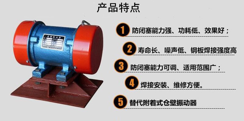 料仓防闭塞装置三相异步振打电机 LZF-6电机仓壁振动器可用于清除各种仓壁、管道粘结物料,还可作为振动给料机、振动输送机、振动漏斗、振动溜槽的振动源等。广泛应用于矿山、冶金、化工、建材、机械等各行各业中。选用时应根据料仓形状及物料特性,选择不同振动力的振动器。如圆锥形料仓因其表面刚度较大,可适当选择振动力偏大的,棱锥形仓料可适当偏小,如单台效果不太好,可选两台或多台组装,或直接将仓壁振动器也称仓壁振打器与料仓内活化器连接,以提高使用效果。仓壁振动器安装位置一般位于料仓锥体高度1/4或小于1/4处。如安装两台以上,可在对称面的不同高度安装,对于木制或混凝土料仓,可在仓壁加装振动板以传递振动力,活化物料。