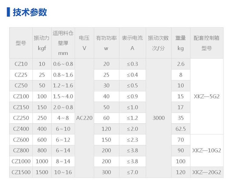 CZ100型电磁仓壁振打器 强激振力可调料仓振动器硅钢片采用鞍钢、武钢产品,提高磁铁、衔铁强度,激振力更强。勇梅机械电磁振动器,又名仓壁振动器。可用于各种振动机械,如给料机,小型输送机,振动筛,振动平台及仓壁振动等等场合,使用灵活方便,振动强度可用控制器随意调节。CZ电磁仓壁振动器(又称振打器)是靠高频振动和冲击力,有效地消除物料由于内磨擦、潮解、带电、成份偏析等原因引起的堵塞、塔拱现象,使物料从料仓口顺利排出电磁仓壁振动器能保证稳定地供料所必需的设备。CZ型仓壁振动器已广泛地应用于矿山、冶金、化工、建材、机械等各行业中。