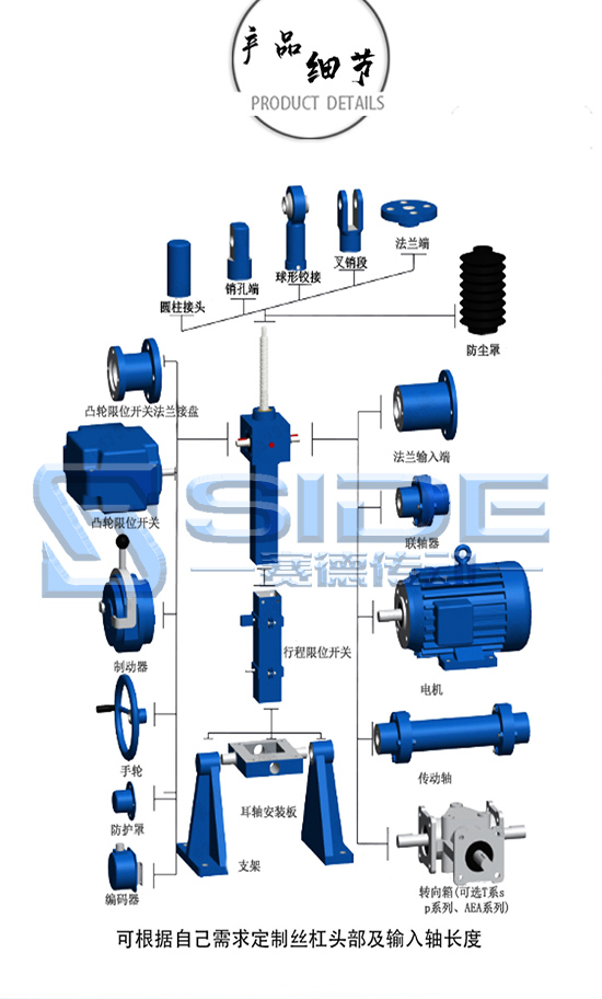 SJ蜗轮丝杆升降机 是一种起重部件,和其他系列丝杆升降机相比具有结构紧凑、体积小、安装方便、输入形式多样、性高、寿命长等许多优点,具有起升下降及借助轴件驱动,反转等多种功能,可单台使用或多台组合使用,该产品可以利用电动机或者其他驱动装置驱动,也可以手动,广泛应用与冶金、机械、水利、医、化工等行业。
