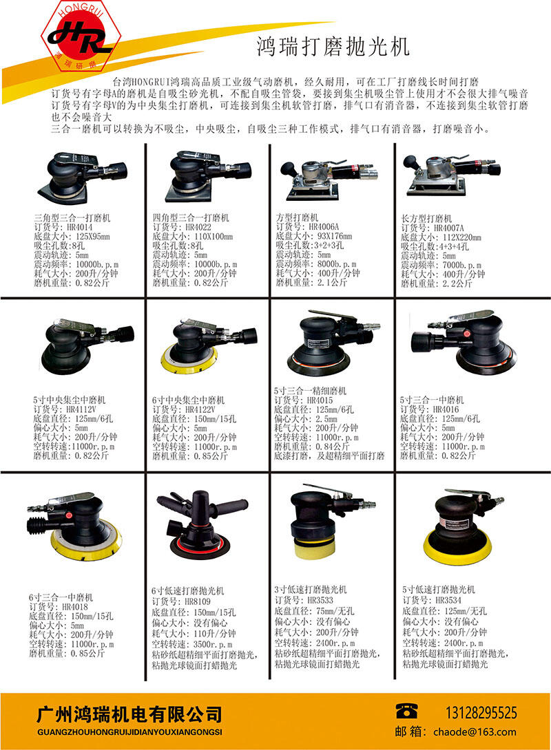 1、自动吸尘款:配自吸尘软管和装粉尘的布袋,在打磨的同时利用磨机排出的压缩空气形成负压,可以吸取部份打磨出来的粉尘到吸尘布袋,吸尘效果不佳。订货号:HR4004D