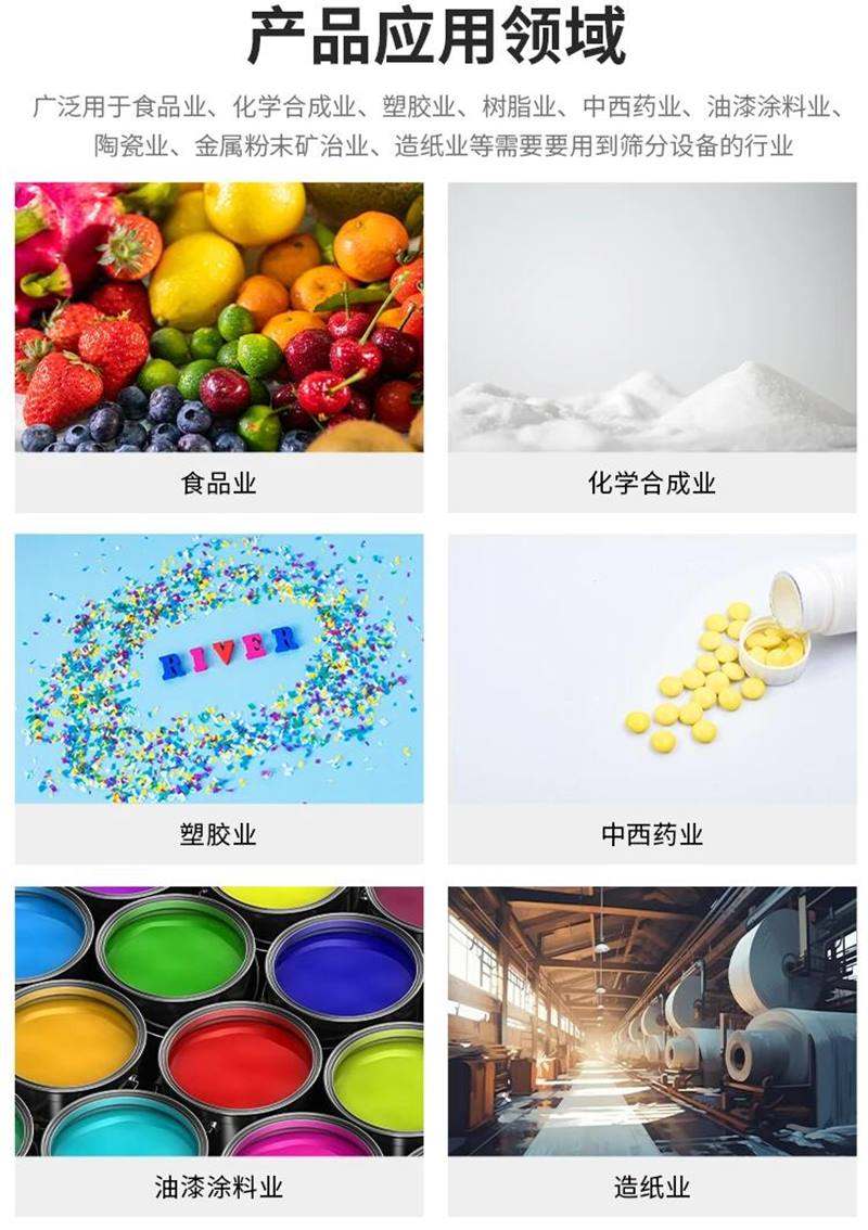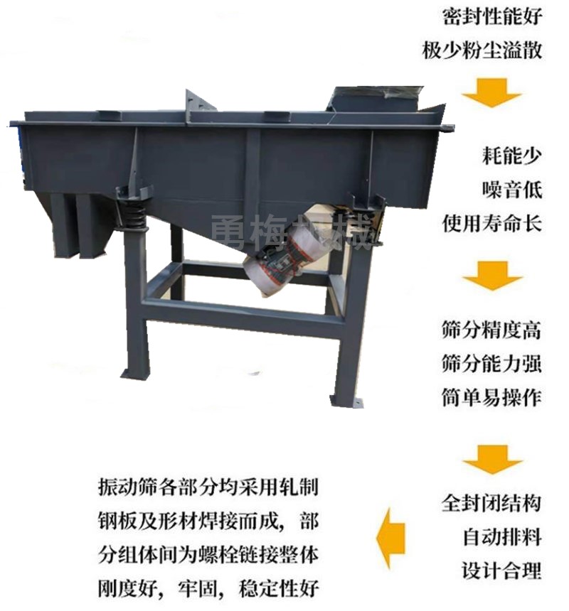 直线筛分机物料从上道工艺通过直线筛进料口的布料装置均匀进入振动筛筛面,物料受力在运动过程中通过筛网,达到不同规格的分级。当纵向安装在筛体上的两台振动电机做相对运转时,两台振动电机两端的偏心块便产生额定激振力,其产生在横向的激振力由于电机的相对运转而相互抵消,其纵向激振力通过传振体传递到整个筛箱上,而使筛面振动,从而使筛面上的物料受其激振力而在筛网面上向出料品方向跳跃运动,小于筛孔的物料通过孔而落到下层,经连续跳跃后从出料口流出,由于筛分过程合理,物料经振动筛分级后,可取得几种不同粒度的物料,完成物料的分级作业。