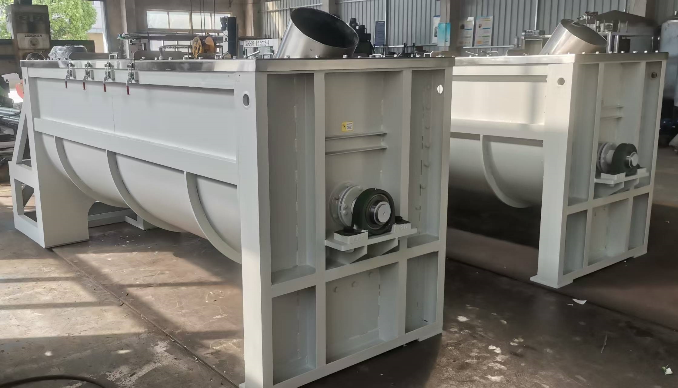 双螺带混合机由驱动机构、双螺带转子和混合简体等部分组成。转子主轴上分布有由内外两条(或4条)不同旋方的螺带,工作时,内螺带推动物料向两侧运动,外螺带推动物料向中间运动;同时,螺带正面推动物料沿螺旋方向运动,螺带背面形成的空洞由上部物料下落后填充。物料形成上、下、左、右全方位的掺混循环。