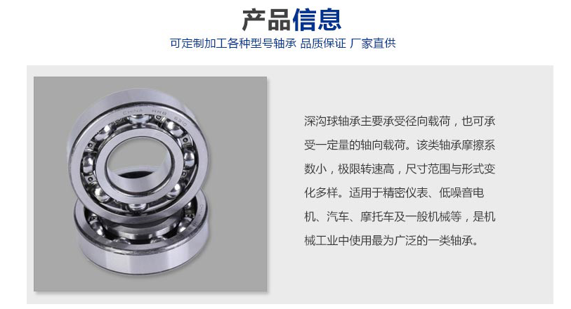 深沟球轴承主要承受径向载荷,也可承受一定量的轴向载荷。该类轴承摩擦系数小,极限转速高,尺寸范围与形式变化多样。适用于精密仪表、低噪音电机、汽车、摩托车及一般机械等,是机械工业中使用最为广泛的一类轴承。