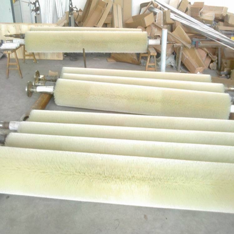 首先将钢轴裁切成合适尺寸,上机床车出毛坯,通过焊接、补强、较直,再经过车床制作出辊芯雏形;然后根据不同要求,分别在辊芯雏形外进行套管或放入模具直接注塑,这样,一条刷辊体的基本形状就已经形成了。将注塑成形或者套管后的辊体毛坯上机床按图纸要求的尺寸进行精细车造,根据不同的工艺要求进行后续处理,如对包胶的辊芯进行精细研磨,轴头需要制做不同的键槽或接口。钻孔植毛式刷辊——使用数控冲孔设备对车造完成的刷辊进行冲孔,孔的深度及密度根据不同要求分别设置。将冲好孔的刷辊放到全自动数控植毛机或半自动马蹄扣式栽毛机上进行植毛作业;植毛完成后,再通过滚筒式剪毛机进行剪毛,这样刷辊表面的刷丝就被剪的平整了。螺旋环绕式刷辊——又称弹簧刷辊,首先用自动条刷设备产出条刷(无间断),再结平台移动设备,均匀的缠绕在辊轴上,两头使用亚壶焊焊牢。环绕式刷辊(弹簧刷辊)工艺制成的刷辊解决了密度高、牢度强等问题。最后一道就是包装了,首先对刷辊进行检验,有漏孔的退回车间返工,对每束刷毛的拉力进行检测,所有检测指标都合格后装入木箱出厂。