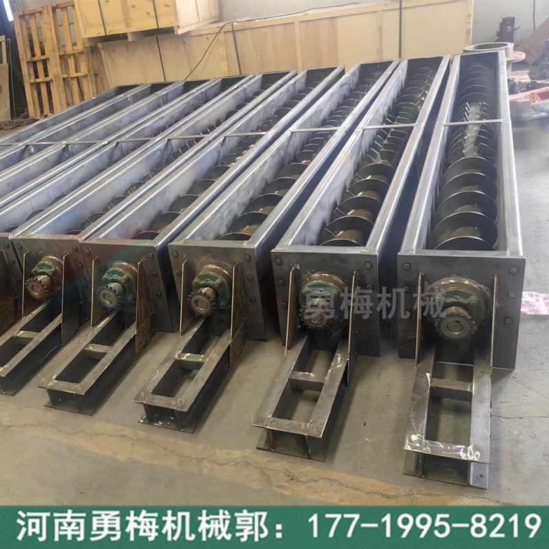 水平输送U型螺旋输送机 绞龙给料机U 型槽体:是输送机的外壳,呈 U 型,一般由锰板卷制而成,端部采用法兰连接,具有良好的密封性和整体刚性,能有效防止物料泄漏。驱动装置:包括电机、减速机等,为螺旋轴的旋转提供动力。螺旋叶片:是核心部件,焊接在螺旋轴上,通过旋转推动物料前进。叶片可根据物料特性设计为实体螺旋、带式螺旋、叶片螺旋等不同形式。
