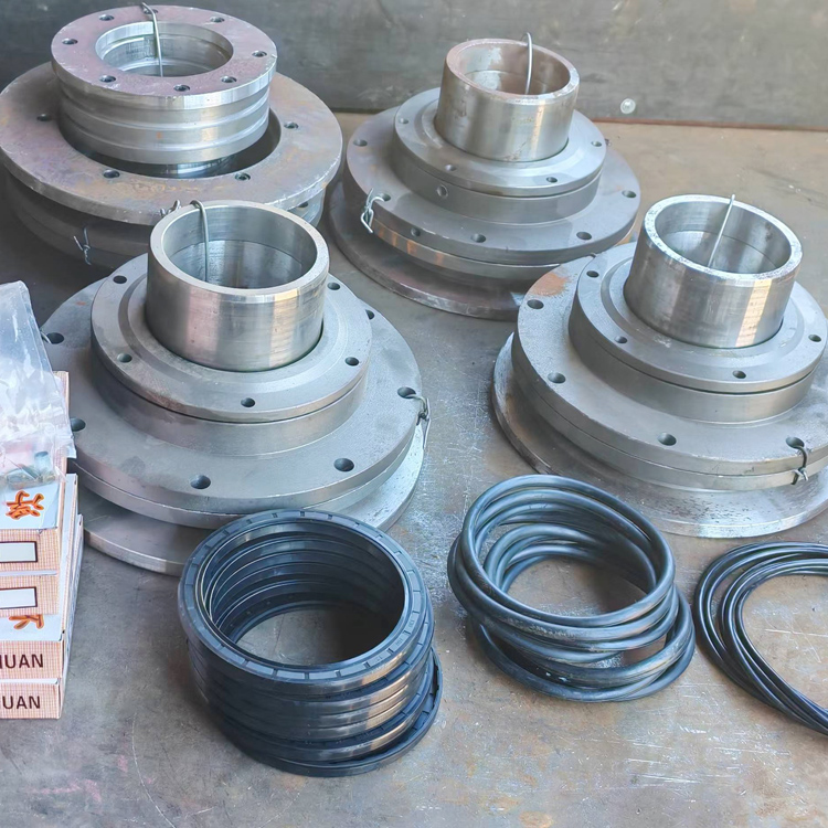 双轴强制js750型混凝土搅拌机轴头端密封总成,跑灰漏浆维修处理等用到的浮动环胶圈油封配件。JS500/750/1000型强制式混凝土搅拌机传动大轴的轴头端密封配件总成,如需更换得看具体厂家机型样式。其主要组成部分有长短轴套,浮动环座,浮动环,O型密封圈,油封,压盖,胶垫,法兰挡盖,间隔套,轴承,沙锥壳,轴承座等组件组成。需确定外径,安装孔中心距,轴孔内径,键槽宽度,子口直径和台阶深厚度等尺寸。