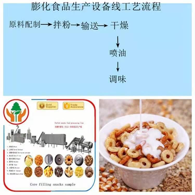 谷物膨化休闲食品是以谷物类原料玉米、小麦、大米、燕麦、荞麦、黑麦、高梁,块根作物原料马铃薯、木薯,瓜果类原料南瓜等作原料,通过挤压、调味、烘焙而成,同时由于调味时可调出原味、烧烤味、牛肉味、鸡汁味、鲜虾味等各种口味,挤压时可制作成各种形状,如片状、豌豆状、条状、球状,使得这类产品用同一条生产线可生产出几十个品种,因而具有极大的发展潜力。